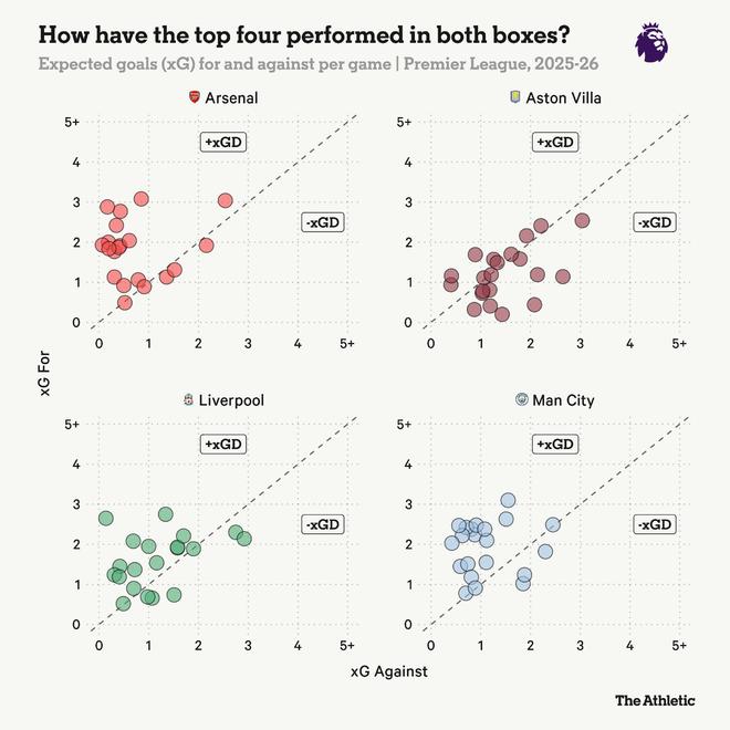 下图绘制了目前排名前四俱乐部中,各场比赛的预期进球与预期失球情况。简而言之,位于虚线上方的圆点表示该场比赛球队创造了比对手质量更高的机会,更有可能获胜——而位于虚线下方的则反之。